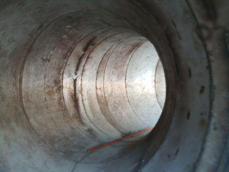 由于該煙囪排放的煙氣中含有氟化氫(HF)氣體;氣體預(yù)冷就會(huì)生成氫氟酸凝露,能強(qiáng)烈地腐蝕金屬、玻璃和含硅的物體,氟是活潑的非金屬,氧化能力強(qiáng),而且氫氟酸中的氟離子的半徑很小,小于氧離子,這導(dǎo)致它有很強(qiáng)的滲透性,致密的氧化物也不能阻止它的滲透。同樣,煙囪管壁在氫氟酸的腐蝕下會(huì)逐漸變薄,嚴(yán)重將會(huì)造成穿孔現(xiàn)象;結(jié)構(gòu)強(qiáng)度喪失;嚴(yán)重影響廠區(qū)安全;所以這種現(xiàn)象必須尋求有效方案進(jìn)行防腐預(yù)防。